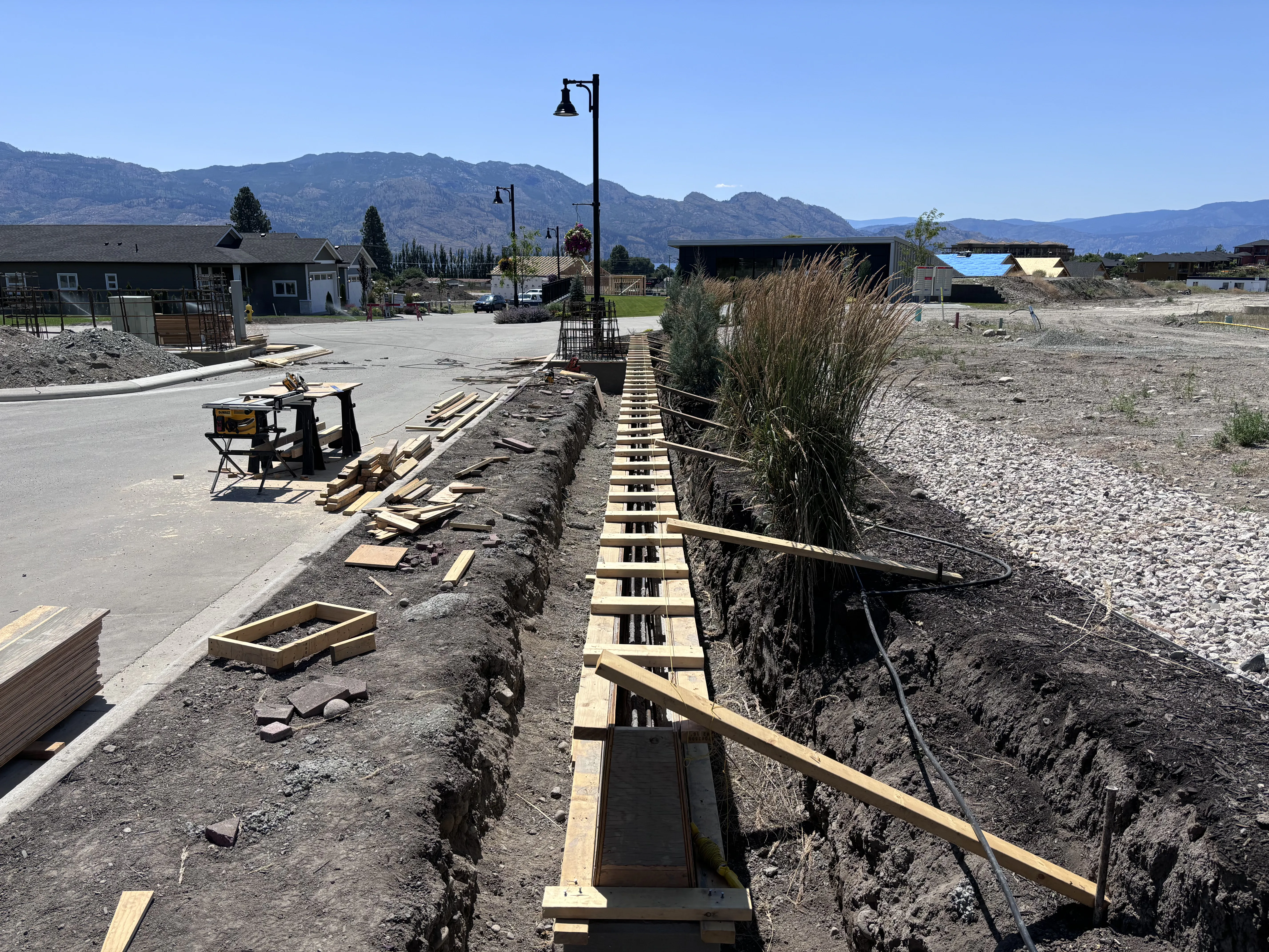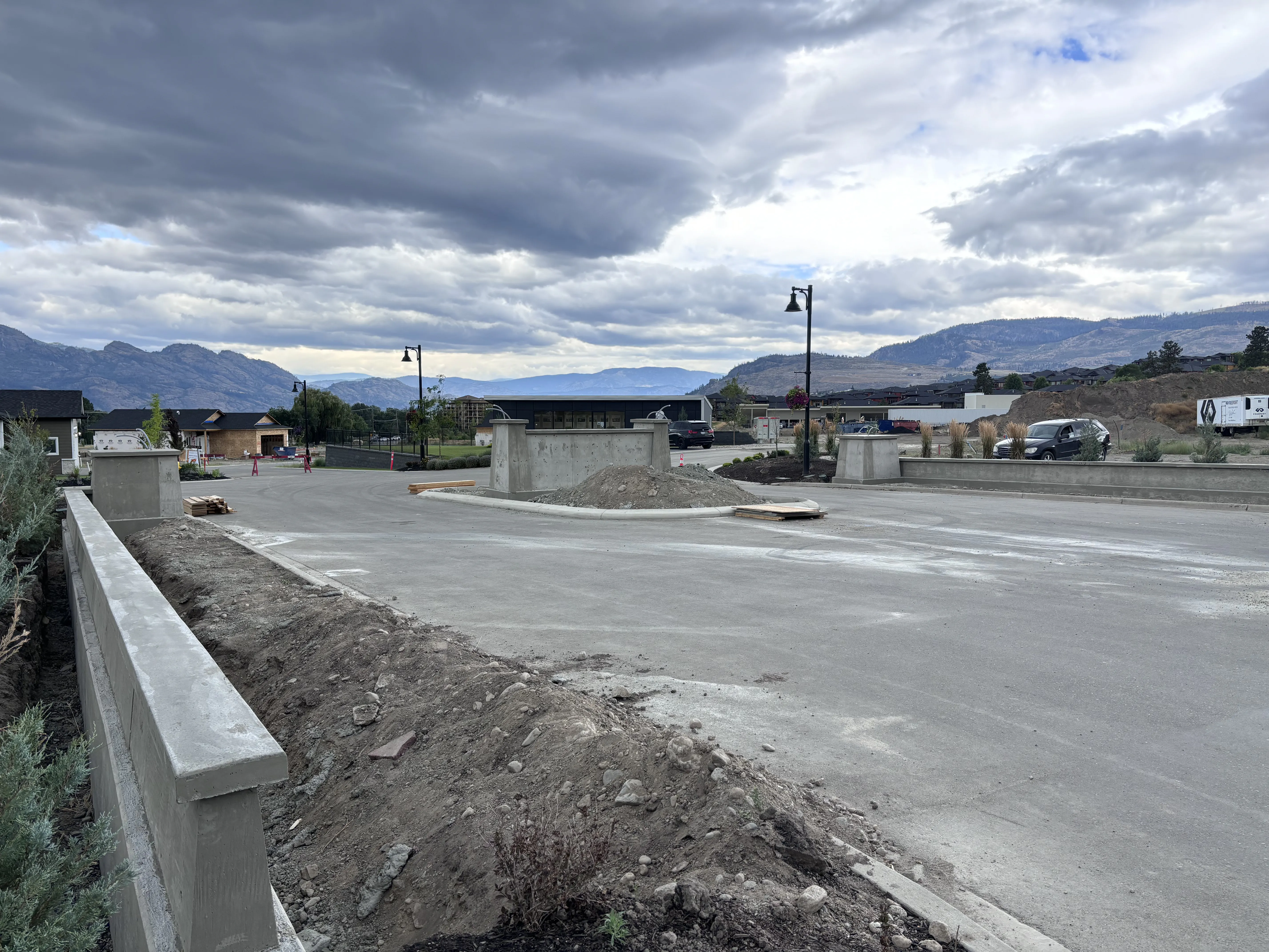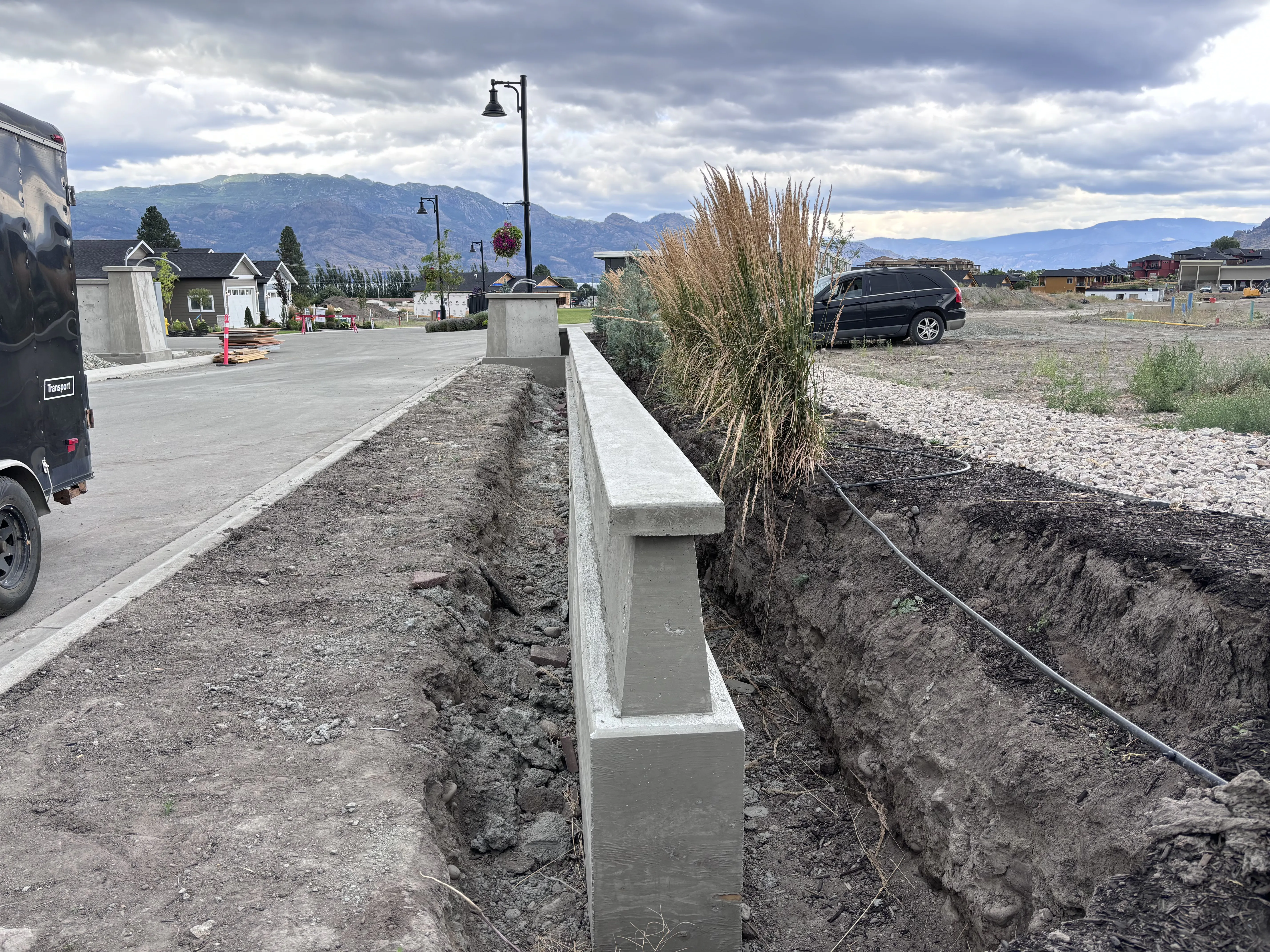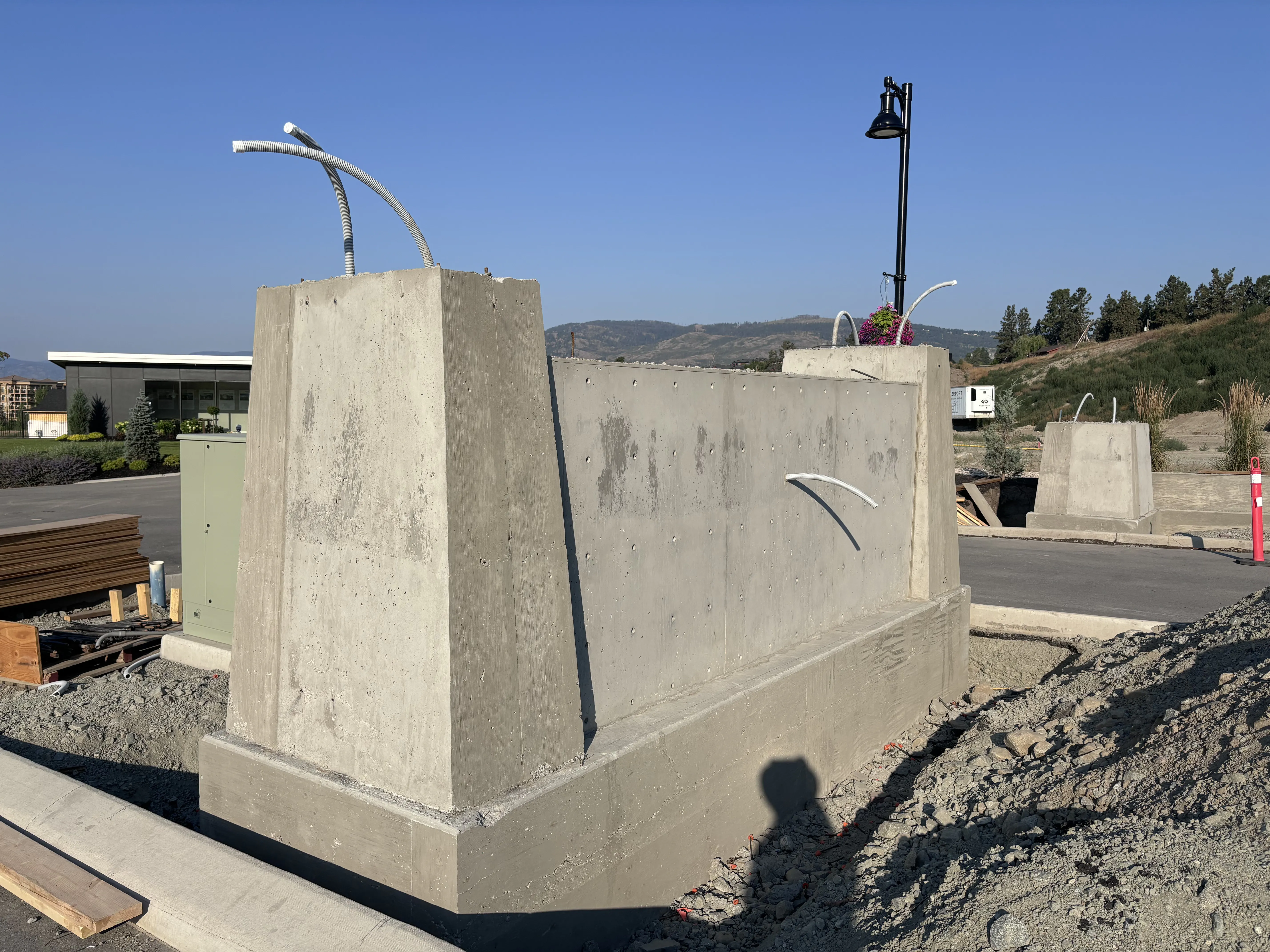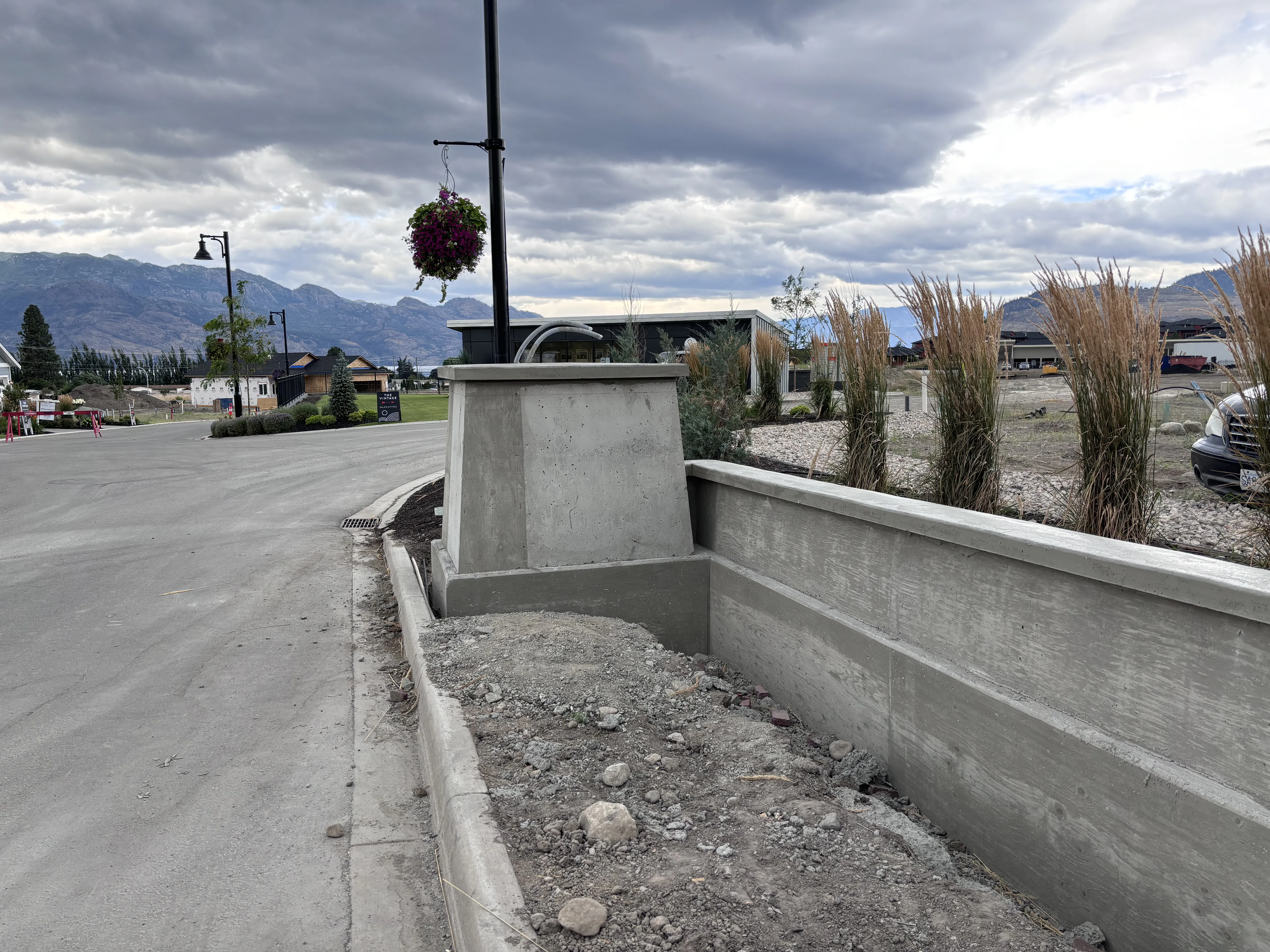 Welcome to the entrance of the New Vintage Living community in Kelowna's Westbank, where Hill Top Form & Finish has crafted a striking central concrete sign and decorative walls for Freeport Industries. These elements beautifully enhance the entryway, adding both style and sophistication.